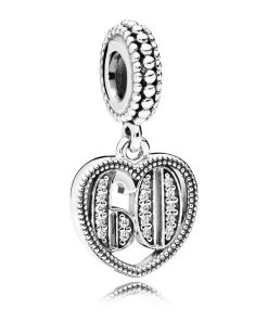 Detailed with the number 60. our celebratory dangle charm in sterling silver is set with glittering cubic zirconia for subtle sparkle. The heart-shaped style is ideal for commemorating a 60th birthday or anniversary – or whatever the number means to you. Thread it on a Pandora Moments bracelet or wear it as a pendant on a necklace chain.