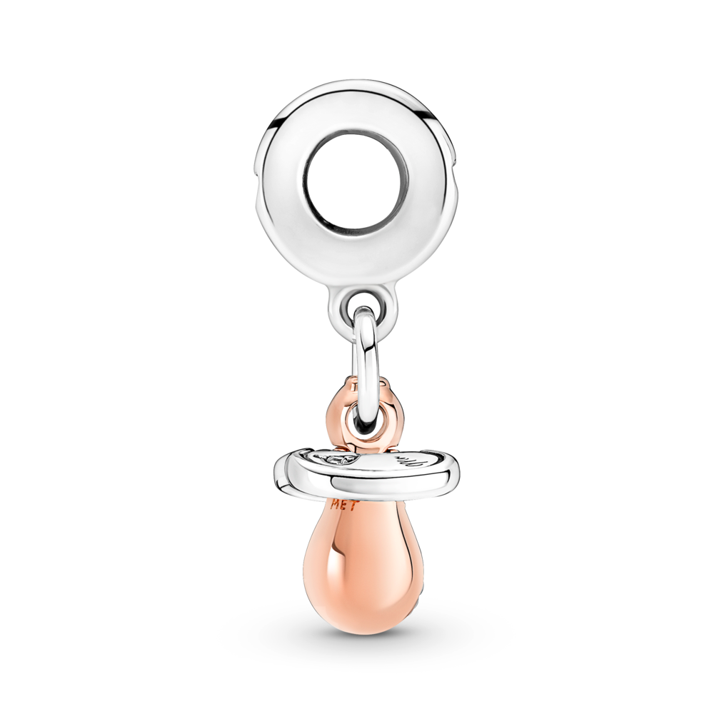 Celebrate a new arrival in the family with the Baby Pacifier Dangle Charm. The 14k rose gold-plated mouthpiece sparkles with a cubic zirconia pavé set in the shape of a heart. The sterling silver pacifier shield is accented with a single stone and is engraved with the words: Made with love. A meaningful addition to a proud mum’s bracelet.
