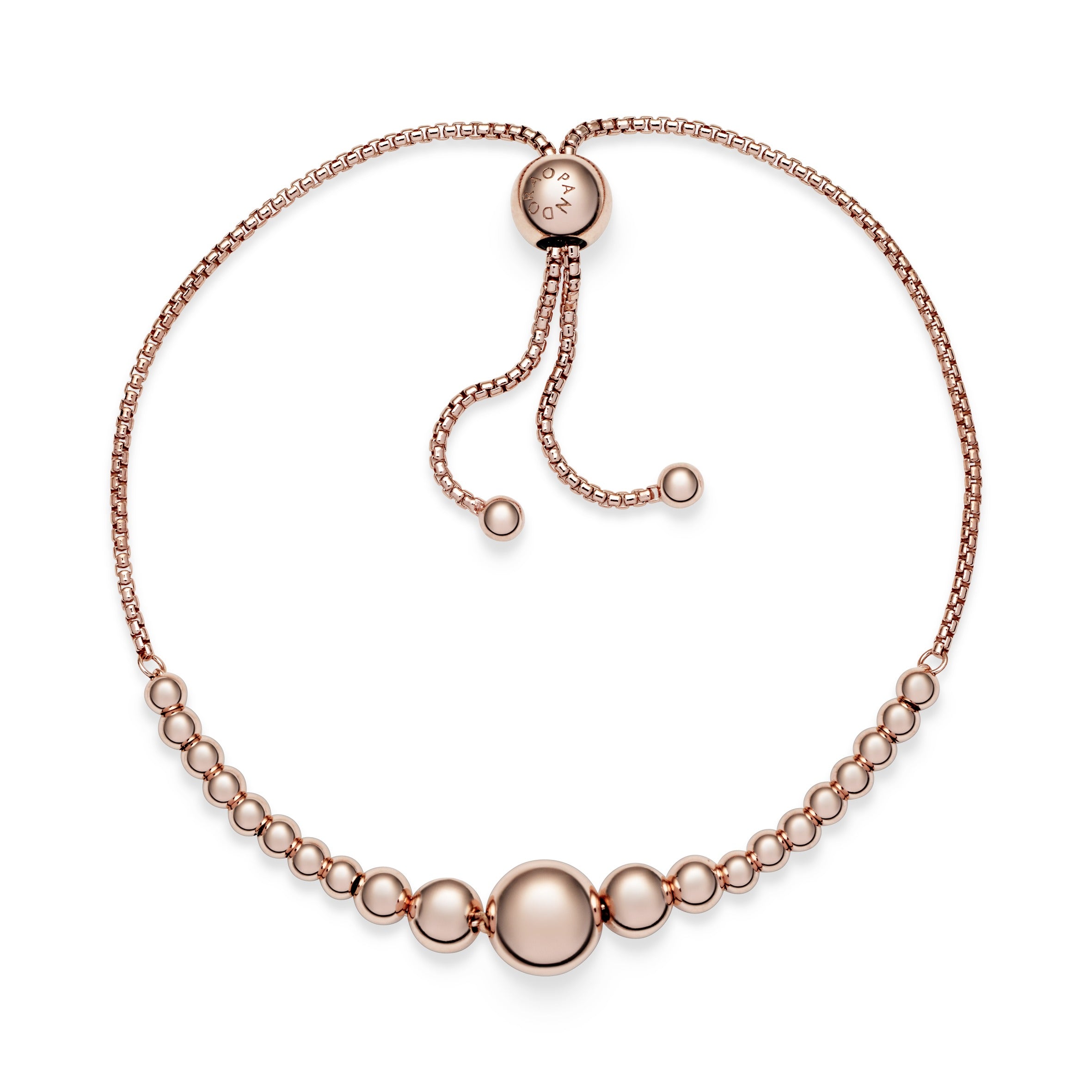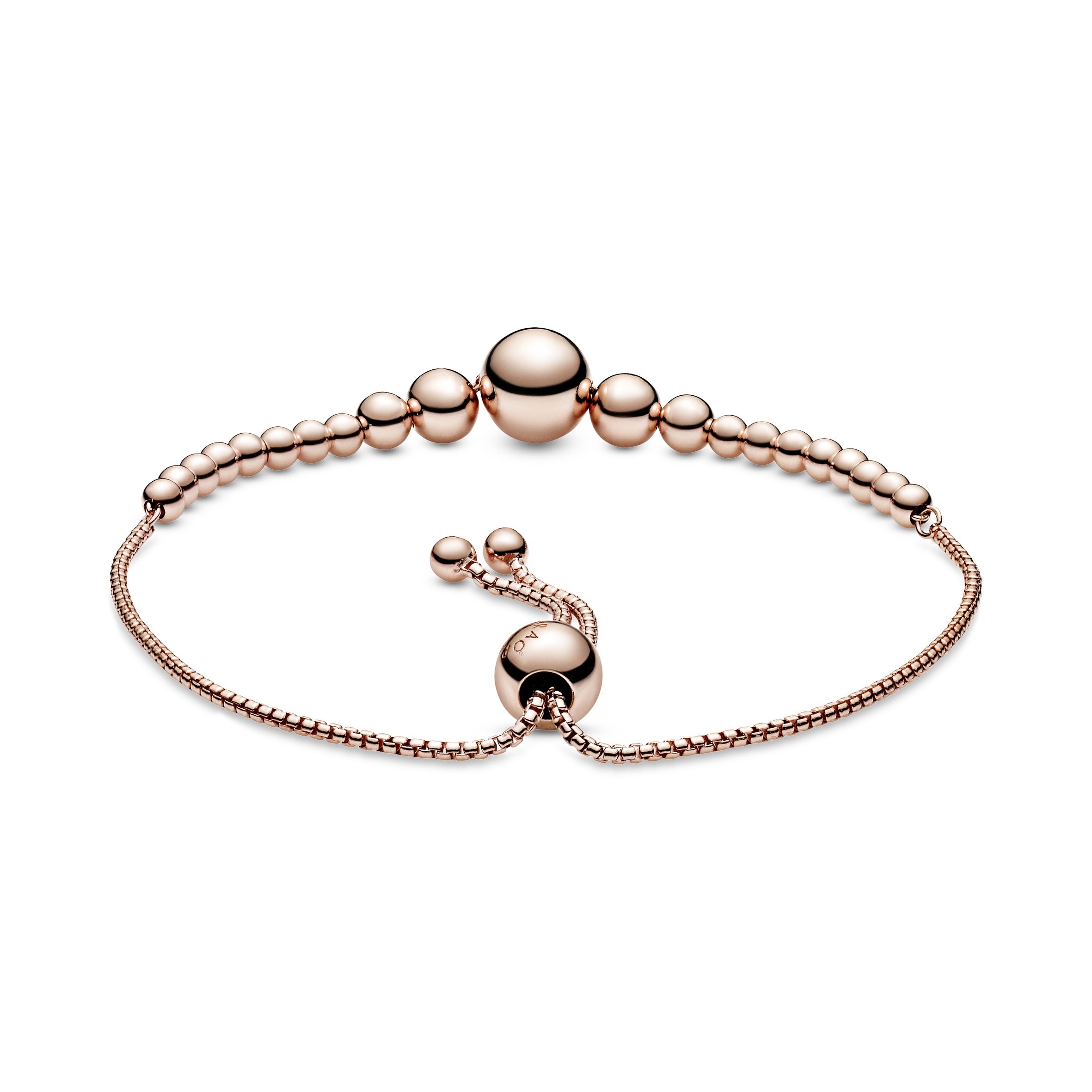 The last word in elegance. the String of Beads Slider Bracelet is minimalist. chic and perfect for stacking. Hand-finished in Pandora Rose (14k rose gold-plated unique metal blend). the design is a sleek addition to your arm and an ideal piece to compliment your other Pandora bracelets. The rose-hued spheres. decreasing in size from the largest at the centre. symbolise continuity. making it a perfect gifting piece to show that your love will always be there.