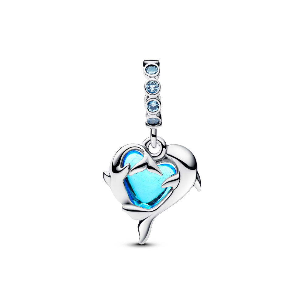 Dolphins sterling silver dangle with aqua blue Murano glass and icy blue crystal