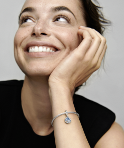 Transport yourself to a peaceful landscape with this sterling silver camping double dangle charm which features one openwork disc depicting a tent and stars. with a cosy campfire set with an orange cubic zirconia. On the other disc is a nighttime landscape with glittery blue and turquoise enamel representing water and a night sky with moon and stars. The back of the dangle charm features the words Sleeping under the stars and the bail features a star detail set with a clear cubic zirconia. Wear it to remind yourself of tranquil nights gazing up at a twinkling sky.