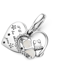Show off your love for cats with the Cats & Hearts Dangle Charm. Hand-finished in sterling silver. this charm features an open front dangle with two cats whose tails form a heart that’s partly embellished with clear cubic zirconia. One cat features hand-applied shimmering silver enamel. while the other wears a collar embellished with clear cubic zirconia. The back dangle features clear cubic zirconia sparkling from star-shaped settings and the engraved message I’ll always be there for you.