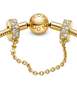 Keep your charms safe and stylish with the Clear Pavé Safety Chain Clip Charm. This safety chain charm is hand-finished in 14k gold-plated metal. It features clip charms on each end. which include silicone grips (which means they don’t fit onto threads). Embellished with clear cubic zirconia pavé. the clip charms contrast with the warm-toned metal to create a sparkling finishing touch that adds flair and security to any look.