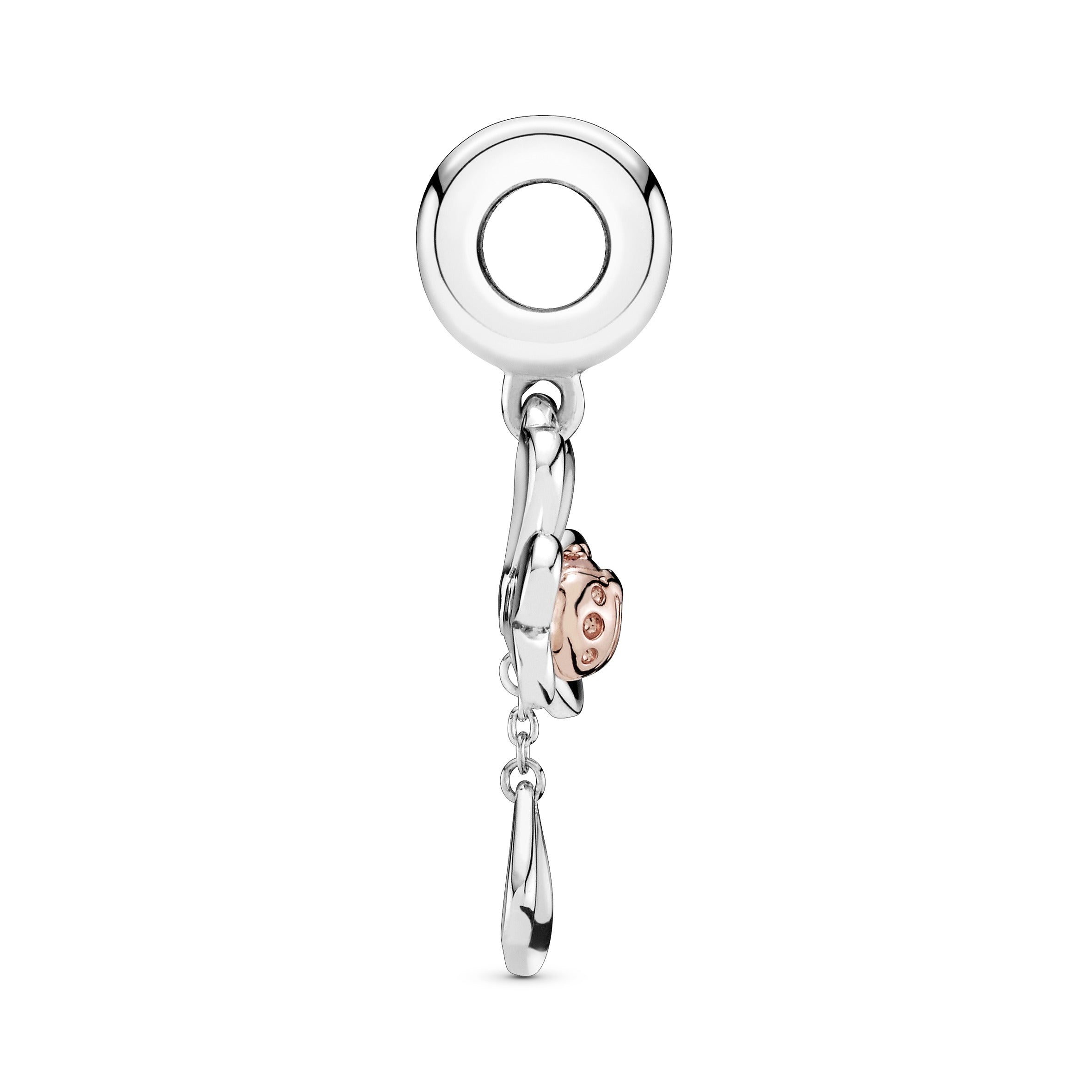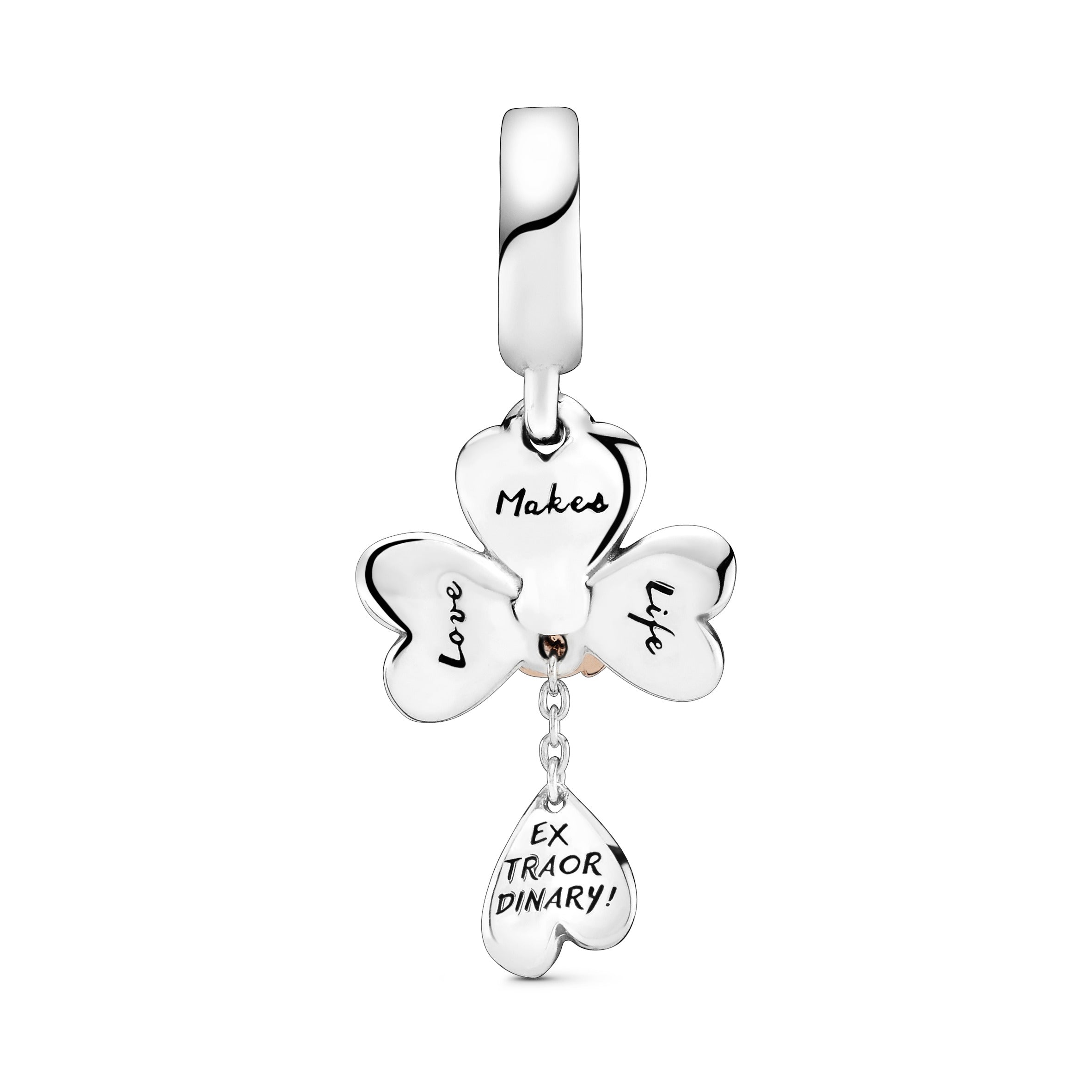 This clover and ladybird two-tone dangle charm is hand-finished in sterling silver and Rose. our 14k rose-gold plated unique metal blend. The lucky four-leaf clover is detailed with a blush-pink ladybird and the engraving Love makes life extraordinary! Wear it on your favourite Moments bracelet or a necklace chain as part of your style story.
