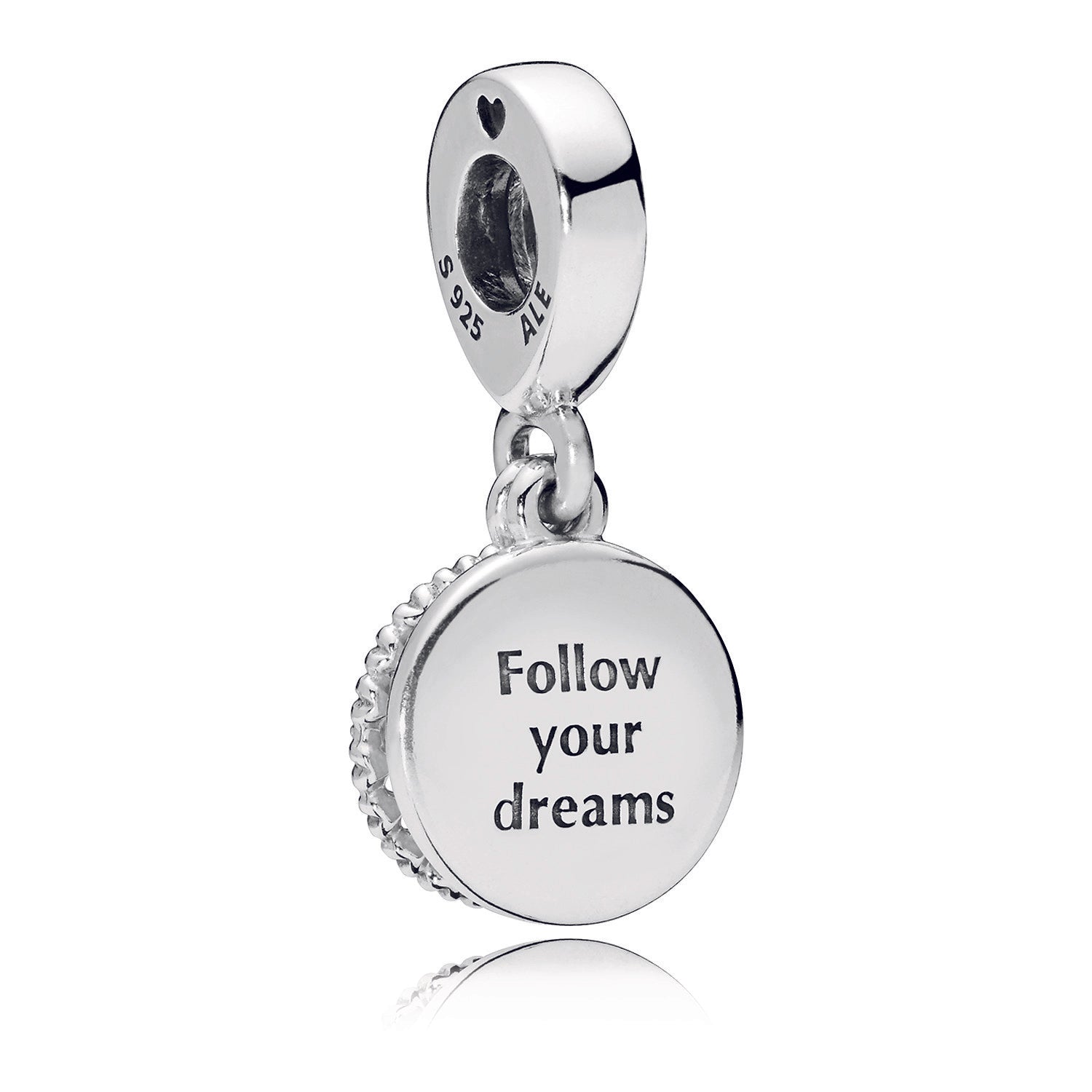 Send your style in the right direction with this dangle charm. Cast in the shape of a compass. an enduring symbol of guidance and protection. this sterling silver charm for Moments bracelets and bangles is centred with a vibrant blue crystal that’s surrounded with shimmering silver enamel and a circle of hearts. The back is engraved with the inspiring message Follow your dreams. Wear it as a reminder to take that leap.