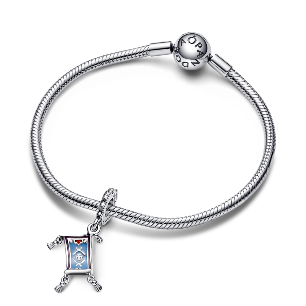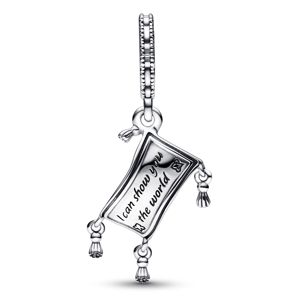 Prepare to be swept away on a magical adventure with this charm inspired by ‘s Aladdin. Celebrate the 30th anniversary of the classic with our Aladdin Magic Carpet Dangle Charm. Crafted from sterling silver. this realistic charm features Carpet’s iconic motifs. created in colourful enamel. finished with moving tassels attached to each corner. The charm is engraved with the words I can show you the world on the reverse. in reference to the iconic scene of Aladdin and Jasmine soaring through the clouds in the night sky. Style this Aladdin Magic Carpet Dangle Charm on your favourite charm holder to face the world with your favourite stories by your side.