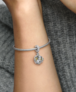 Enter the magical world of ‘s Beauty and the Beast with this evocative double dangle charm. ‘s Belle and the Beast dance within an openwork frame surrounded by roses set with man-made yellow crystals. The ballroom is depicted in a background disc in transparent yellow hand-applied basse-taille enamel technique. The bail features 3D rose details. Commemorating the imperfect but magical love between Belle and the Beast. the dangle charm is engraved with the phrase Beauty is found Within.