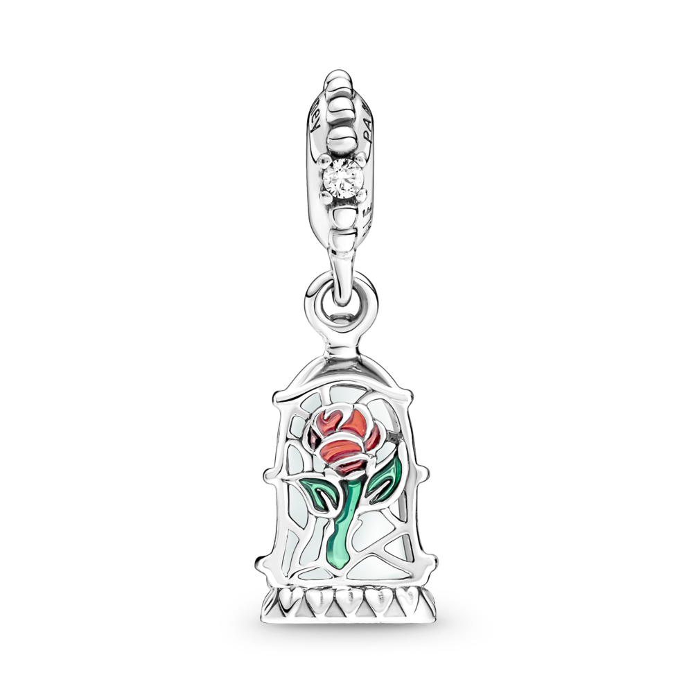 Add a magical touch to your style with with the Beauty and the Beast Enchanted Rose Dangle Charm. It features a transparent light blue Murano glass dome with engraved stars encasing a cut-out rose with red and green hand-applied enamel details. Hand-finished in sterling silver. the charm is decorated with clear cubic zirconia stones and micro-beads on the bail and features the engraving Beautiful as a Rose on the bottom. A spellbinding reminder of the power of love.