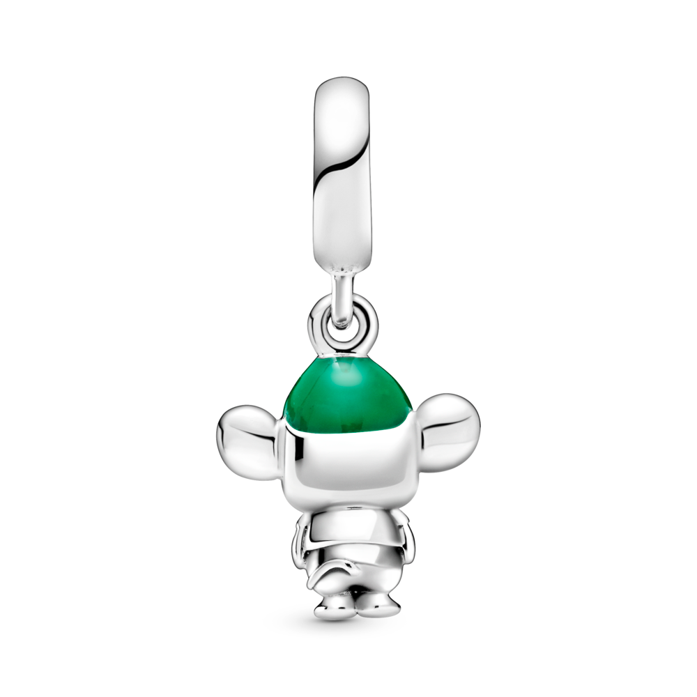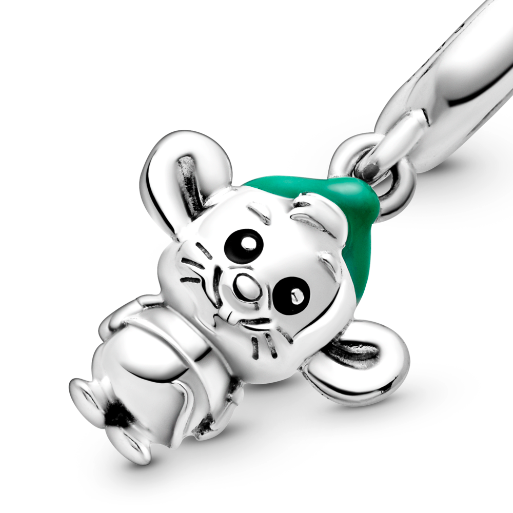 Carry around a loyal companion with the Cinderella Gus Mouse Dangle Charm. Hand-finished in sterling silver. this piece is inspired by one of the mice that befriends ‘s Cinderella. Dangling from the bail. the design features hand-applied black enamel eyes. a short T-shirt. grooved whiskers. a tail. large ears and hair coming out from under a hat decorated with hand-applied green enamel. Pair this piece with other Favourites to stage your own adventure.