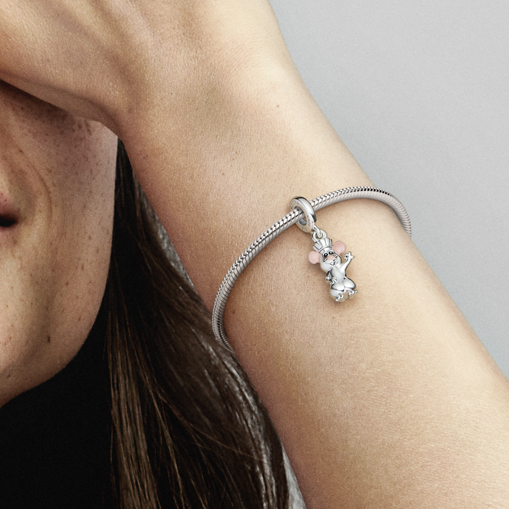 Follow your dreams with Pixar’s Remy. This sterling silver dangle charm features Remy from and Pixar’s Ratatouille wearing his chef’s hat and making a chef’s kiss gesture. Hand-applied pink enamel colours his ears and nose and black enamel brings his eyes to life. Style this charm on your jewellery as a reminder to follow your heart and never give up.