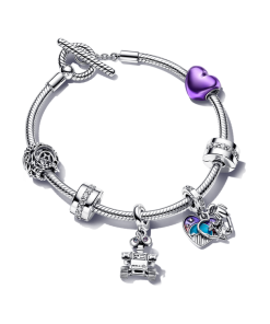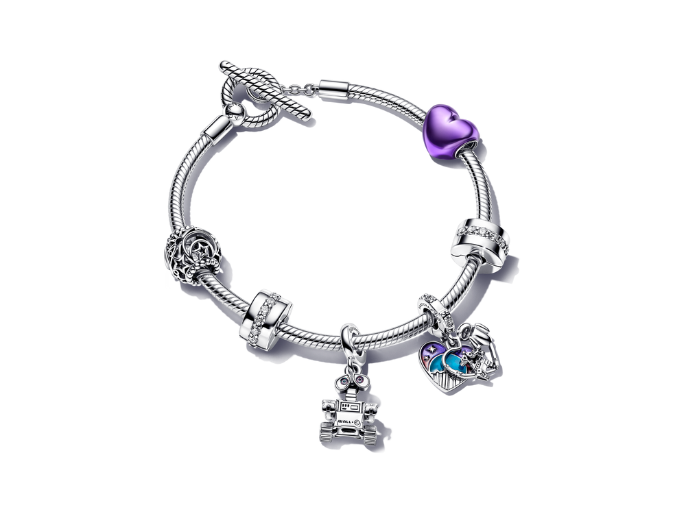 Special features: a cut-out heart with raised Wall-E giving Eve a plant ; Wall-E and Eve’s eyes looking at each other capturing their love; Eve sits on the edge of the cut-out heart; the background heart-shaped disc features raised skyline; a moon and sky with raised stars and enamel details behind the skyline; the moon contains glow-in-the-dark enamel; engraved message and imprinted stars on the reverse of the heart disc; bail features mechanical details with stones.