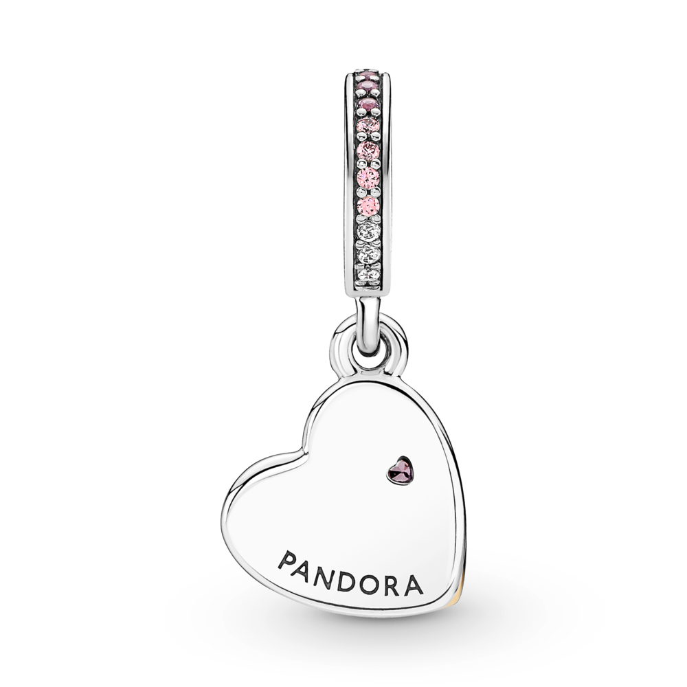 Double up on love for Mum with the Entwined Infinite Hearts Double Dangle Charm. A 14k rose gold-plated heart with pink man-made crystals glow next to a sterling silver heart. engraved with the words: You are the heart of our family. The bail is accented with a pavé of pink and clear stones. The perfect gift for someone who always has a special place in your heart.