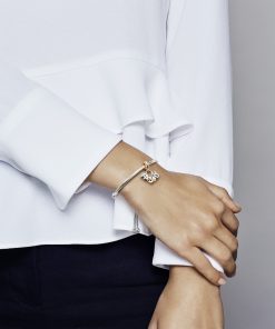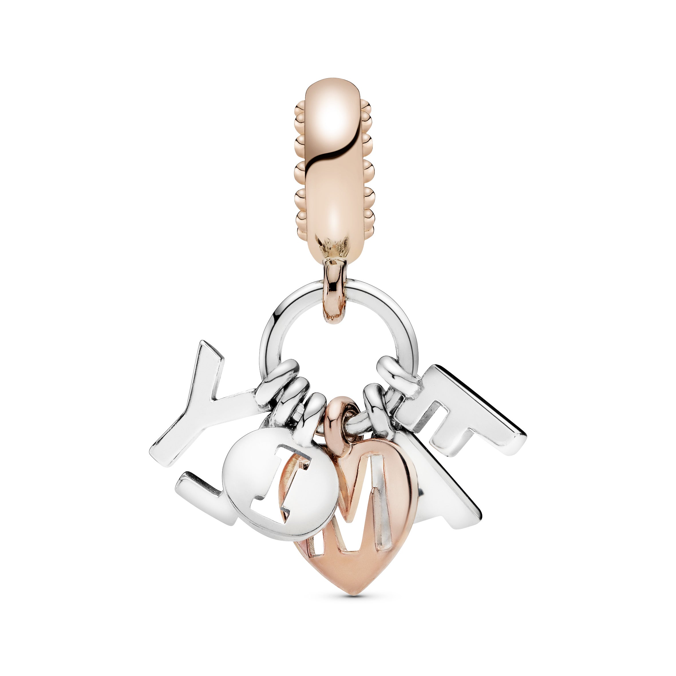 Wear what matters the most to you on your bracelet with this playful dangle charm in sterling silver and Rose. our 14k rose gold-plated unique metal blend. Made to be worn on Moments bracelets. the two-tone design holds six letter charms that spell out the word family. You can also wear it on a necklace as an alternative to a pendant that reminds you to keep your family close.