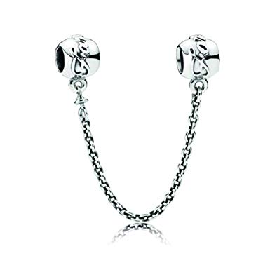 Keep charms in check while showing the importance of family with our safety chain for Moments bracelets. Cast from sterling silver. the charms are detailed with a swirling script that reads Family and Forever. The safety chain charm is fitted with swivel ends to prevent it from tangling. Thread one side onto your bracelet before adding charms. connecting the unattached side of the safety chain once your charms are in place.