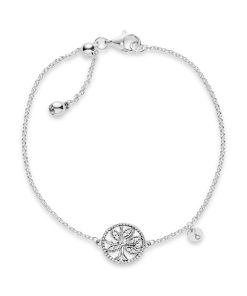 Wear the story of your family bonds with our sterling silver bracelet. centred with a family tree medallion. Set on a white enamel background with milgrain beading. the tree blossoms with cubic zirconia accents to represent the people closest to you. The bracelet has a slider clasp for the perfect fit and looks great styled together with other family tree-inspired styles for a meaningful look.