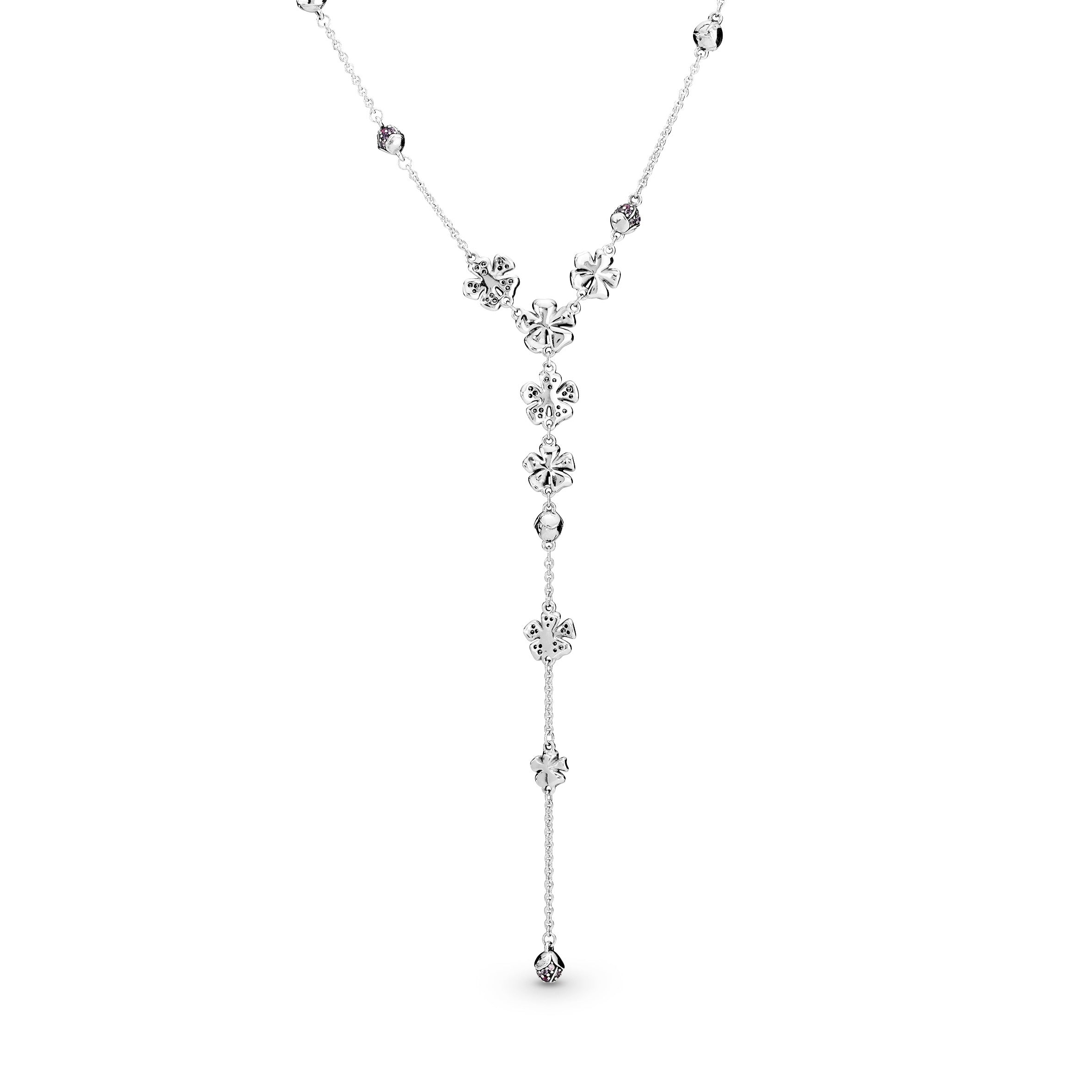 A Y-necklace is an elegant way to draw attention to a neckline. This iteration is inspired by the beauty of nature. where flowers in bloom are detailed with tonal enamel. pink crystals and cubic zirconia stones. Delicate buds complete the design. It’s fitted with a slider clasp for the perfect fit. Wear solo. with a plunging neckline. to show it off.