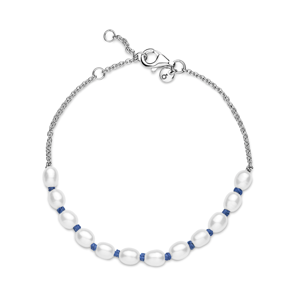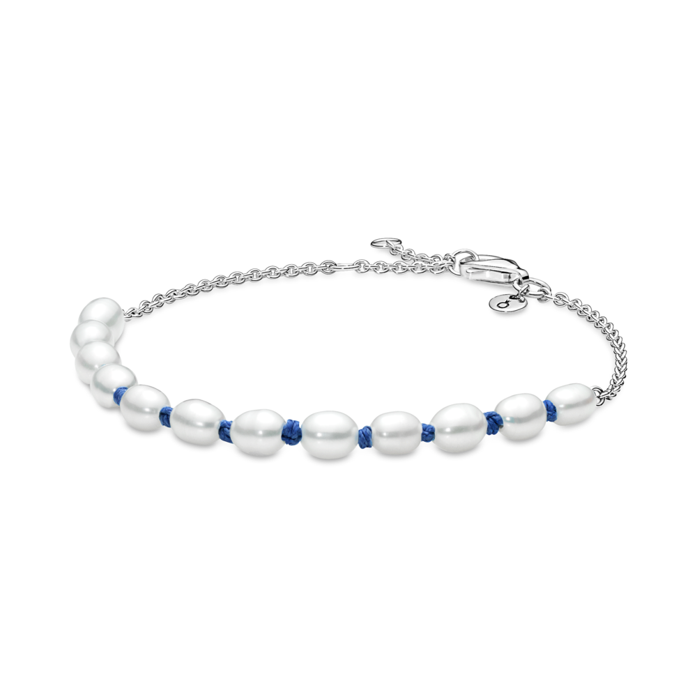 Introducing the perfect pearl statement to layer into your looks. Inspired by sunny days on the beach. one half of this pearl bracelet features a row of freshwater cultured pearls strung onto knotted blue cord. The other half is a sterling silver chain with an easy lobster clasp closure. featuring a small disc near the clasp engraved with the Crown O. Note: normal wear and tear may occur with natural materials such as pearls.