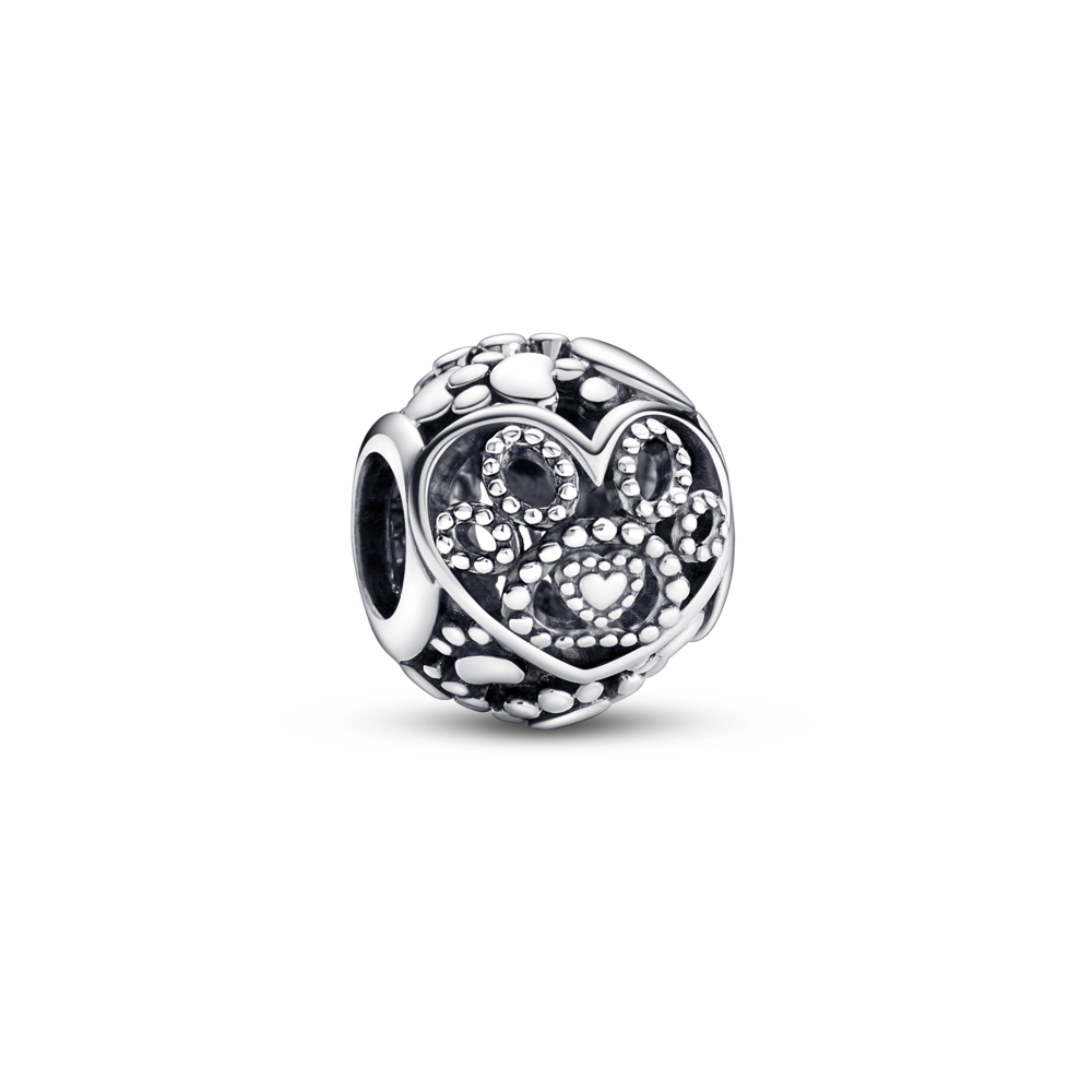 A must-have charm for fur mums. Crafted in sterling silver. this loving tribute to your pet features openwork paw prints and heart outlines with the words Fur Baby inscribed on one side. Raised microbeads outline the heart at the centre of the paw prints. Wear this charm as a celebration of how much our four-legged companions enrich our lives.