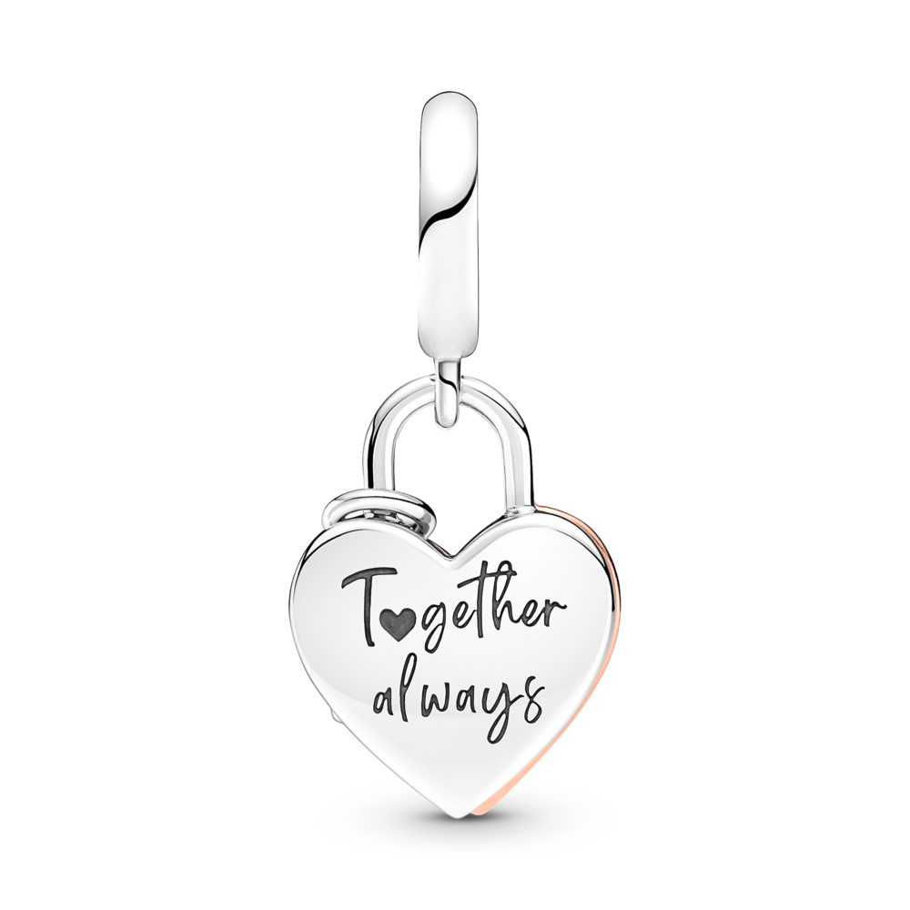 This Heart Padlock Double Dangle Charm is decorated with a tiny padlock. inspired by the locks that lovers place on bridges around the world to represent their everlasting love. The meaningful charm features the silhouette of a heart in 14k rose gold plating that outlines a sterling silver heart pavé-set with brilliant-cut cubic zirconia. The sterling silver padlock is finished with the engraving Together always and holds the two elements next to eachother. symbolising two hearts coming together as one.