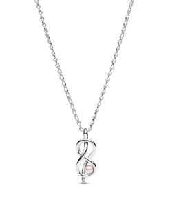 Infinity knot sterling silver pendant necklace with pink lacquered artificial pearl and clear cubic zirconia
