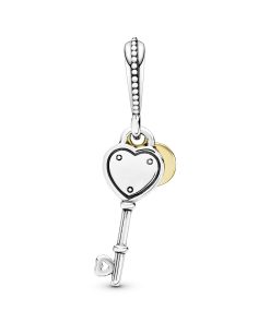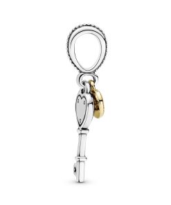 Lock down your personal style with this two-tone dangle charm. The heart-shaped key dangle charm is hand finished in sterling silver and features a keyhole made from 14k gold. To continue the theme. key is shaped as a heart for a romantic touch. Wear it on a your favourite necklace chain as a symbol of love or add it to your Pandora Moments charm collection.