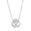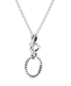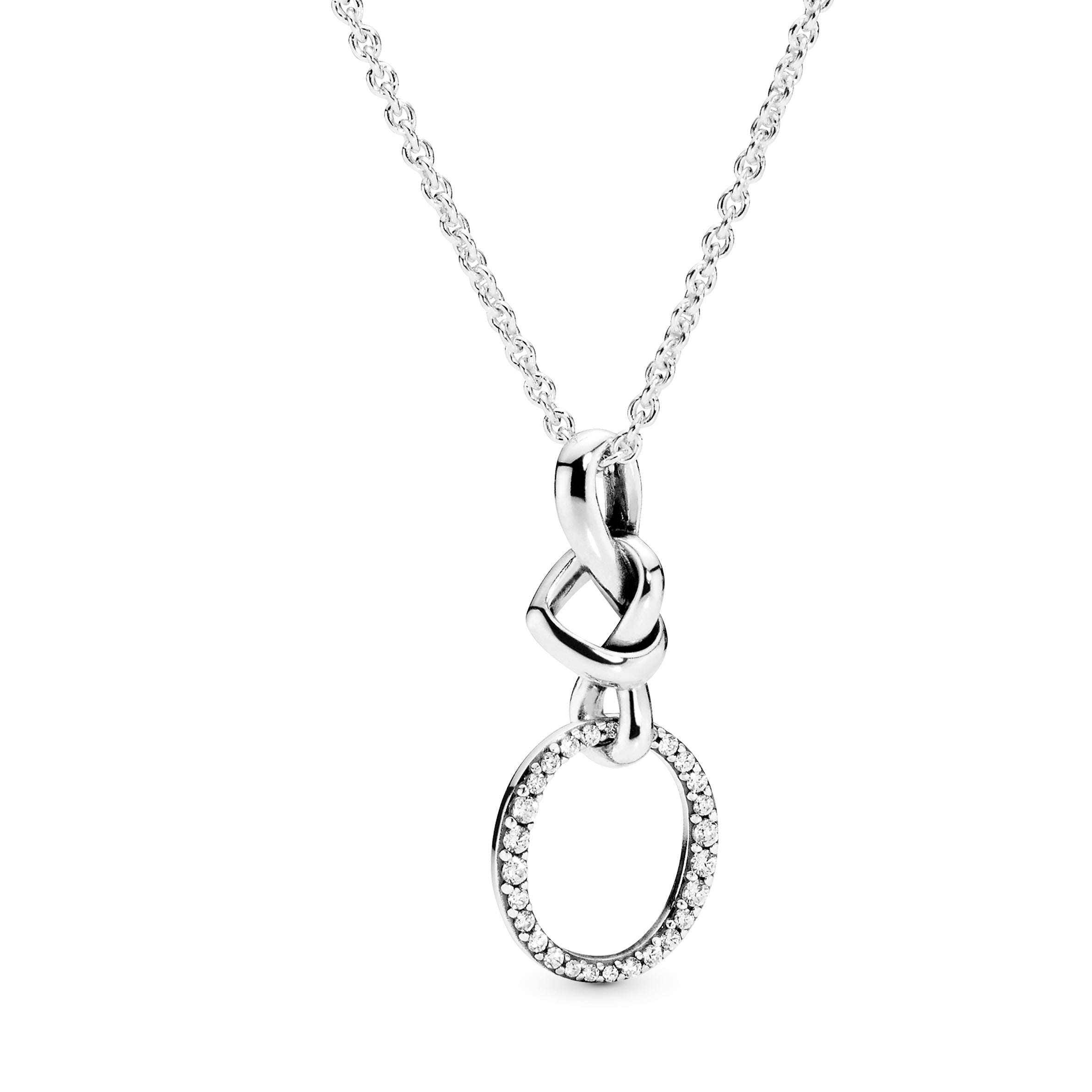 Add personal meaning to your look with this sterling silver necklace. The timeless. hand-finished design holds a pendant shaped as a knotted heart with a stone-studded oval inspired by our Pandora crown O. The slider clasp ensures the perfect drop to complement any neckline. Wear it solo or style with other necklaces that tell your story.
