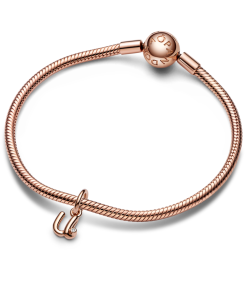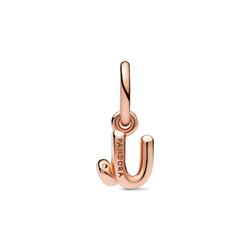 Special features: Three-dimensional bend wire shaped like a u; Pandora logo engraved on back; stone set in front of the letter; oval-shaped closed bail.