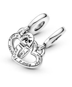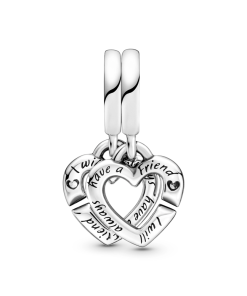Show off your sisterly bonds with the Linked Sister Hearts Split Dangle Charm. Hand-finished in sterling silver. this charm includes two linked open hearts. each featuring a sparkling clear cubic zirconia stone and engraving (one says Sis and the other reads Sister). On the back. each heart has small heart-shaped cut-outs and is engraved with I will always have a friend. The hearts can be separated. so one can be gifted to your sister – a reminder of your forever bond.