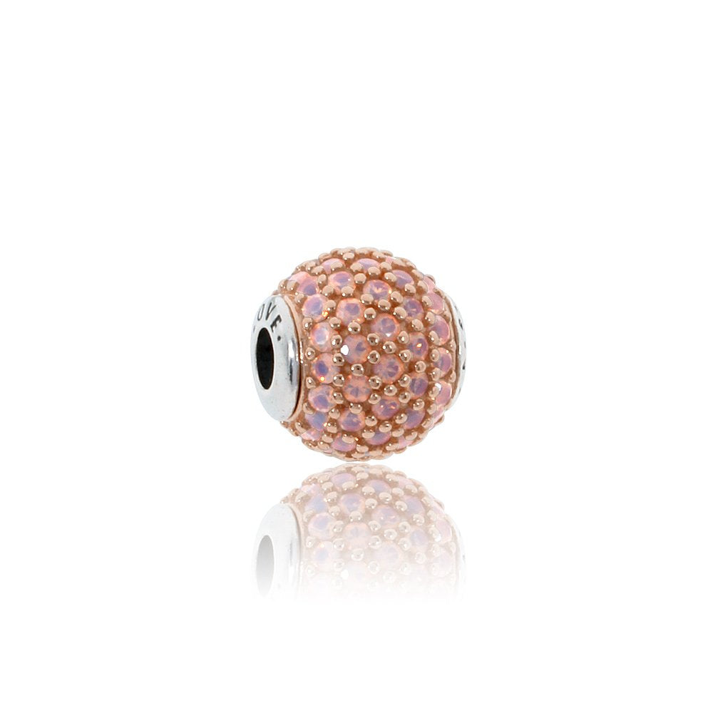 A tender and inspiring 14k rose gold and sterling silver charm by PANDORA ESSENCE COLLECTION. decorated by hand with opalescent pink crystals.