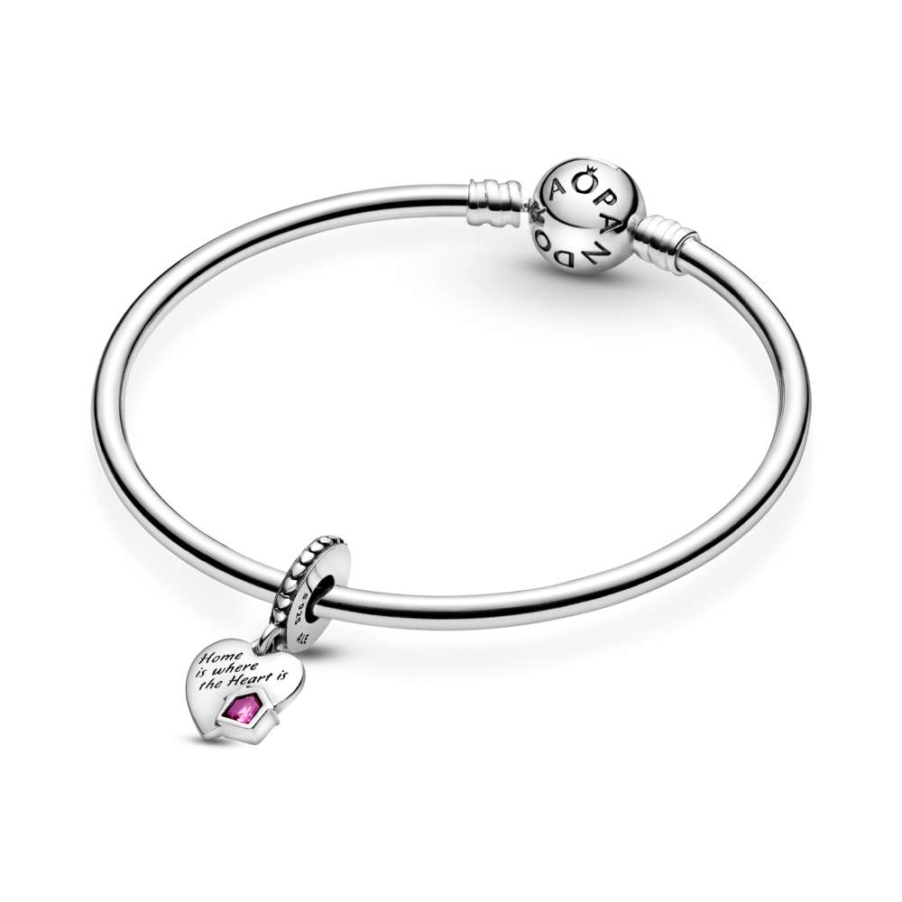 Wear a reminder of your roots with the Love My Home Heart Dangle Charm. Hand-finished in sterling silver. this charm features a heart-shaped disc with the engraving ‘Home is Where the Heart is’ and a house-shaped sparkling pink crystal stone inside a raised house outline. The disc’s back side includes a raised house and engraved heart that resembles smoke coming out of a chimney. It’s a sweet and meaningful way to carry your home with you wherever you go.