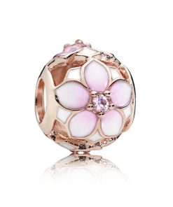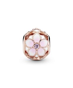 Perfect for creating a floral story on a favourite Pandora Moments bracelet or bangle. this radiant Pandora Rose charm is cast from our unique metal blend plated with 14k rose gold. Detailed all around with enamelled magnolia flowers centred with pink crystals. it’s openwork design is weightless to wear. You can also thread it on a necklace as a pendant.