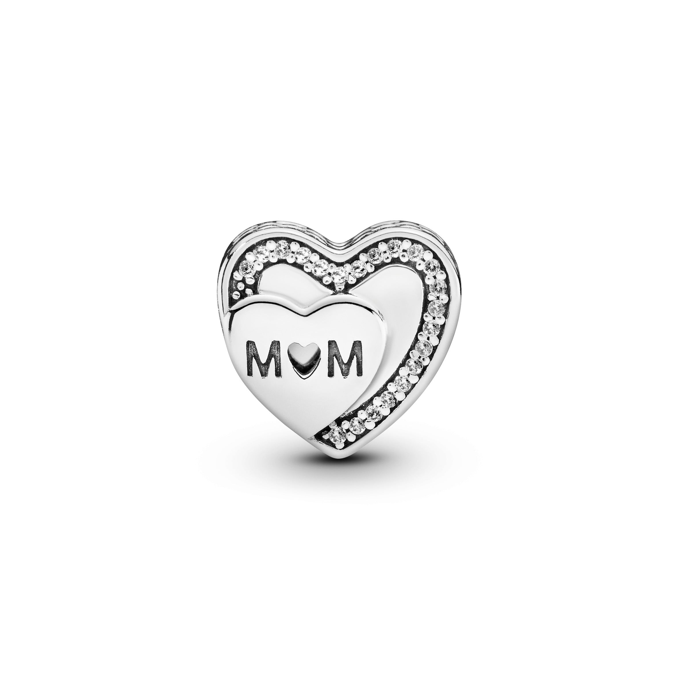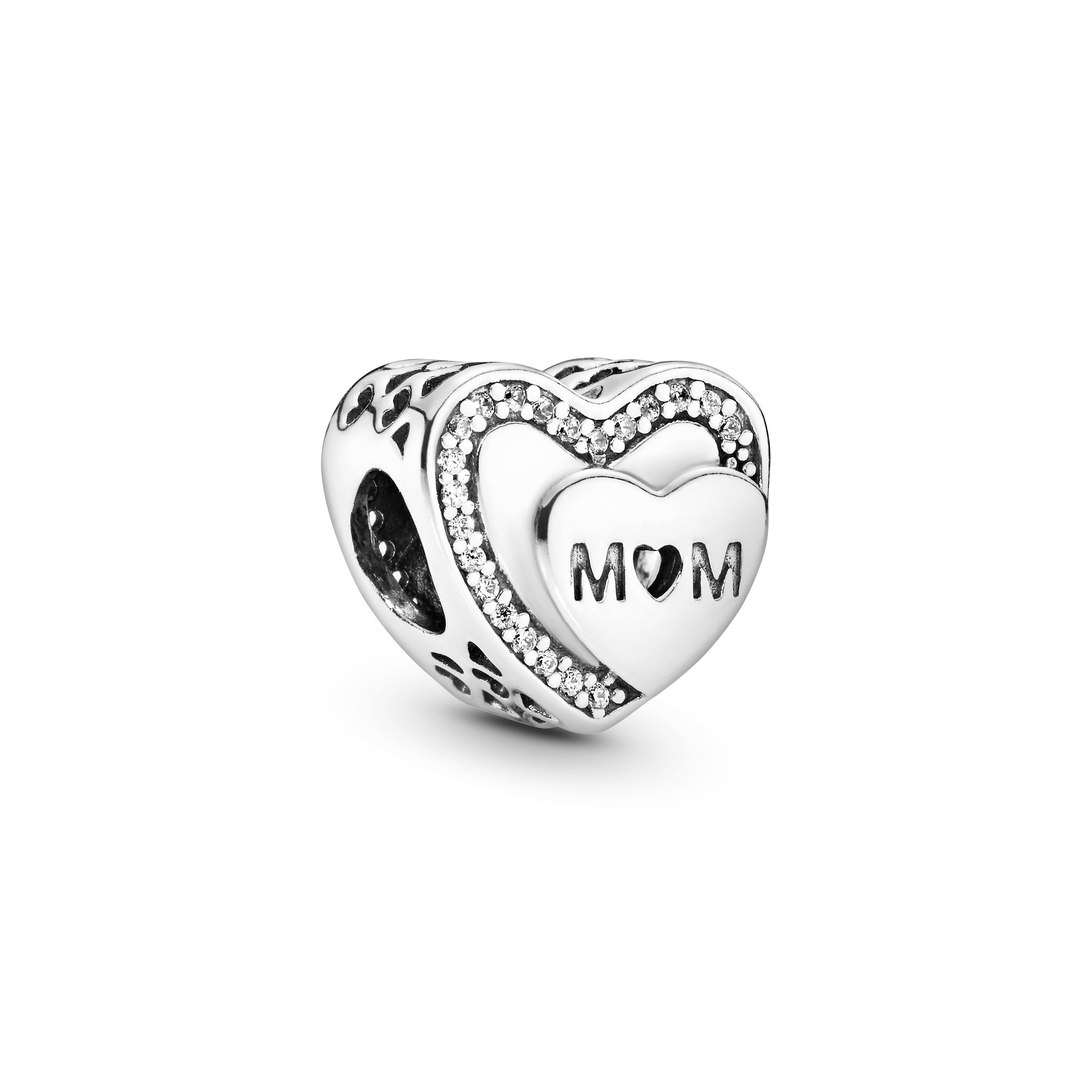 Show who you are or someone you love what they mean to you with this heart-shaped charm. made for mums and mother figures (and Pandora Moments bracelets). The double-sided. sterling silver design is framed with cubic zirconia and cut-out hearts and the small. off-centre heart is engraved with Mum in a lasting tribute to the special lady.