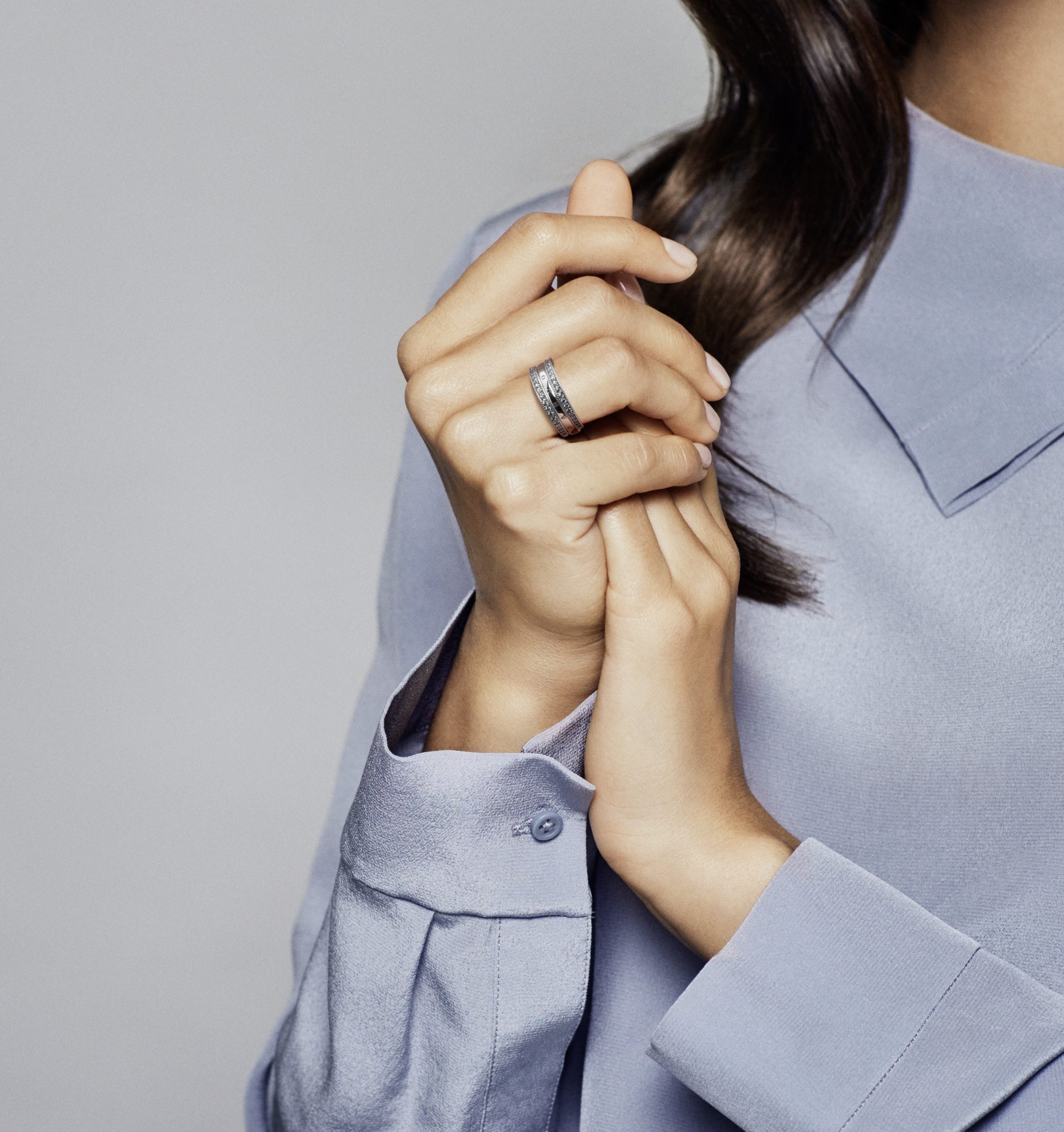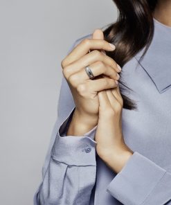 Create multiple looks with just one reversible ring in sterling silver. detailed with our logo and signature hearts. The hand-finished band ring features two lines of clear cubic zirconia that flip from side to side. so that you change up the look to suit your mood. Style the reversible piece with the logo or the cut-out hearts. you decide. Wear it solo for a statement look or as part of a ring stack with similar styles.