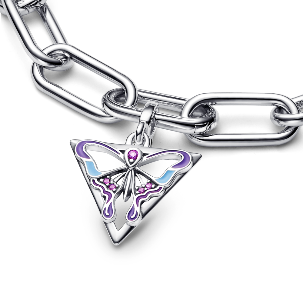 Our ME Butterfly Medallion will bring a symbol of freedom to your styling. The butterfly is a symbol of transformation. femininity. beauty and colour. With its pale purple man-made crystals and blue enamel details. this sterling silver medallion showcases the butterfly within an outline of a triangle. so you can add a completley new shape to your everyday looks. Style the mini dangle on openable styling connectors on your link chain necklace. bracelet or hoop earrings and let your style speak volumes.