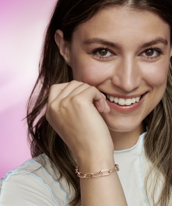 Special features: a statement link bracelet with a carabiner clasp; three openable connectors each with grooved lines on the sides following the shape of the links; the carabiner clasp and the openable connectors open inwards with springback function; links are grouped in pairs of two or more links. depending on the size of bracelet; logo engraved on two sides of the carabiner clasp. Styling note: one set of interlocking links between each connector corresponds to one double link. four small interlocking links or one styling link; replaced with same length elements to keep the size and length of the necklace 1:1; you can style medallions with openable top parts on both links and connectors; style mini dangles with closed top parts on openable connectors only; for a custom look exchange the three connectors with other connectors or the links in between with other links of the same length; each openable connector can be styled with a maximum of 8 Me mini dangles or 2 Me medallions. Inspiration: enjoying the ultimate level of personalisation and freedom of styling for an individual. customised look.