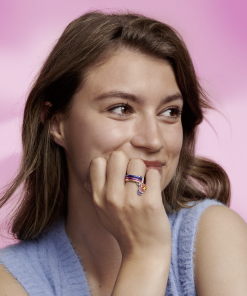 Ring Metal: sterling silver Enamel: transparent acai purple Motif: band ring with enamel. Special features: transparent enamel on top of silver creates a metallic look; stamped logo on the polished inside intercepting a grooved centre line. Inspiration: stacking and endless styling possibilities; connect stacked rings with ring connector; enjoying the ultimate level of personalisation and freedom of styling for an individual. customised look. Sizing: we recommend to follow our regular ring sizing but when adding more rings to your ring stack. the fit may feel tighter.