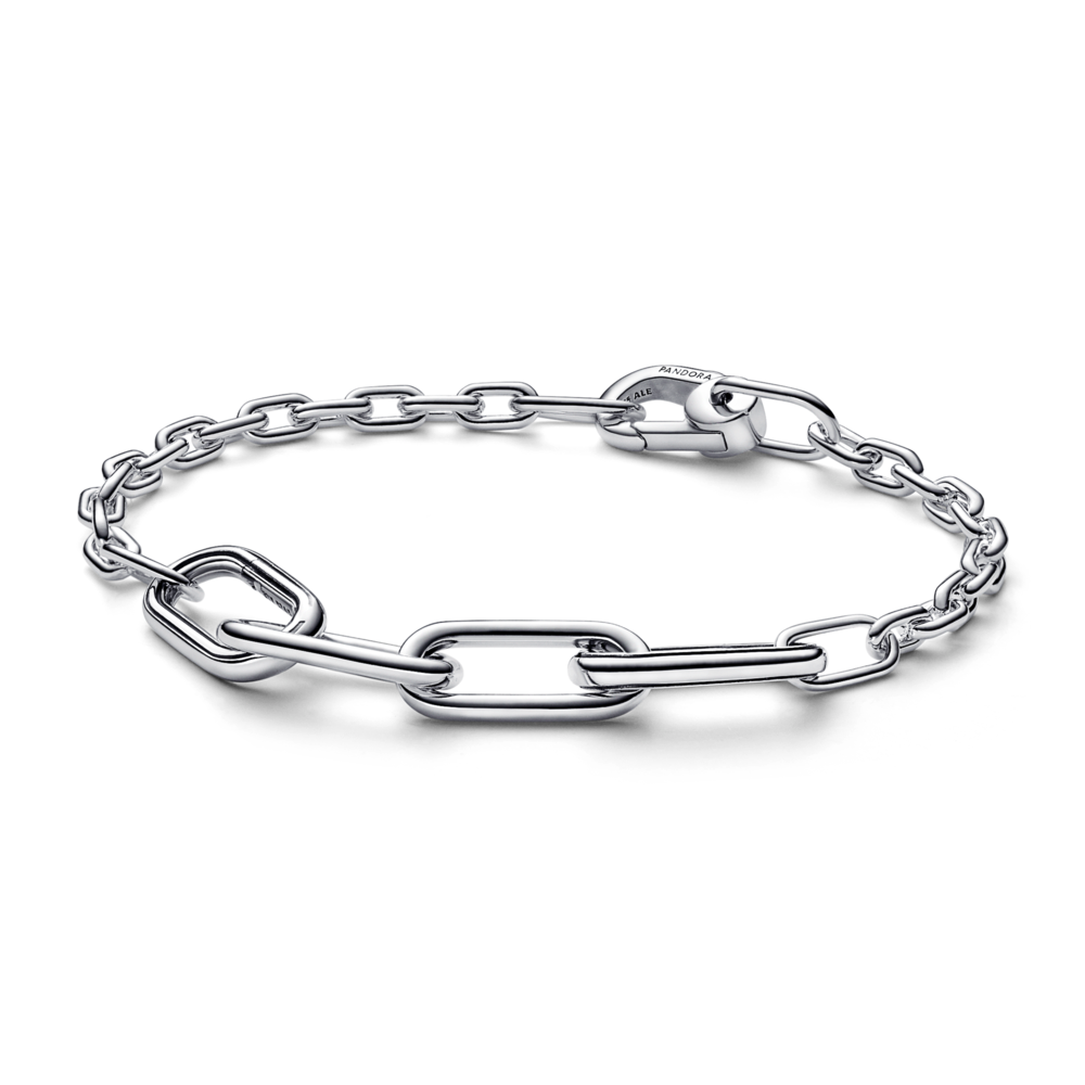 Link what you love like never before. Our sterling silver ME Slim Link Chain Bracelet holds endless styling possibilities. with more dimensions of links than ever before. The design features two larger openable styling connectors separated by a double styling link. a line of slimmer link chains and a carabiner clasp closure. First customise your link chain: four links can be swapped out for one styling double link or one styling link – keep the original length or adjust it to suit you. Once you’ve curated your link chain. style up to two meaningful medallions or up to eight mini dangles on each openable styling connector to show the world who you are. Note: medallions with openable tops can be styled on closed styling links.