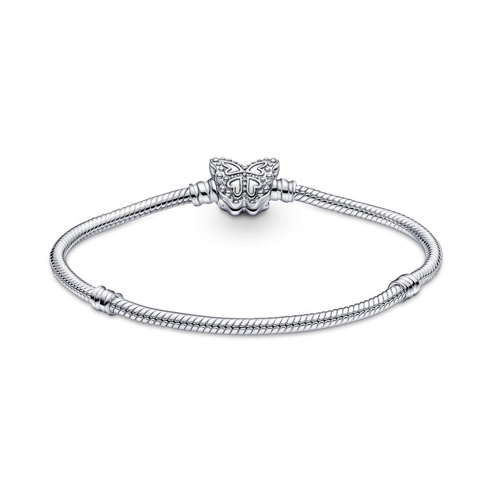 Tell your spring story and be inspired by the season of transformation with our sterling silver Moments Butterfly Clasp Snake Chain Bracelet. Cut-out and raised heart details and sparkling bead-set round brilliant-cut clear cubic zirconia give depth and dimension to the butterfly’s wings. Style up to 18 charms on the bracelet and carry spring moments with you wherever you go. Pair it with other sterling silver pieces. like our Blue Butterfly Hoop earrings.