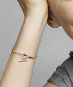 Add a warm-toned accent to your look with the Moments Heart T-Bar Snake Chain Bracelet. Hand-finished in our 14k rose gold-plated unique metal blend. this piece is an updated take on the Moments snake chain bracelet. Featuring a heart-shaped T-bar double circle closure. loop the T-bar through the smallest circle to guarantee that the bracelet clasp is securely closed. Wear this sleek. modern style with up to 10-13 Moments charms and dangles.