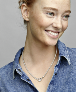 Special features: heart clasp formed with two holes within an infinity 8-shape; one lower leg of the infinity motif functions as an openable clasp; the lobster-like clasp features spring-back function that secures closure and the shape of the heart; logo at an angle on the front and back of the heart clasp; the chain is flexible with the inner core consisting of a boston chain and on the outside silver sections formed as a quartet of spherical and pyramid studs attached to one another by folding and connecting.