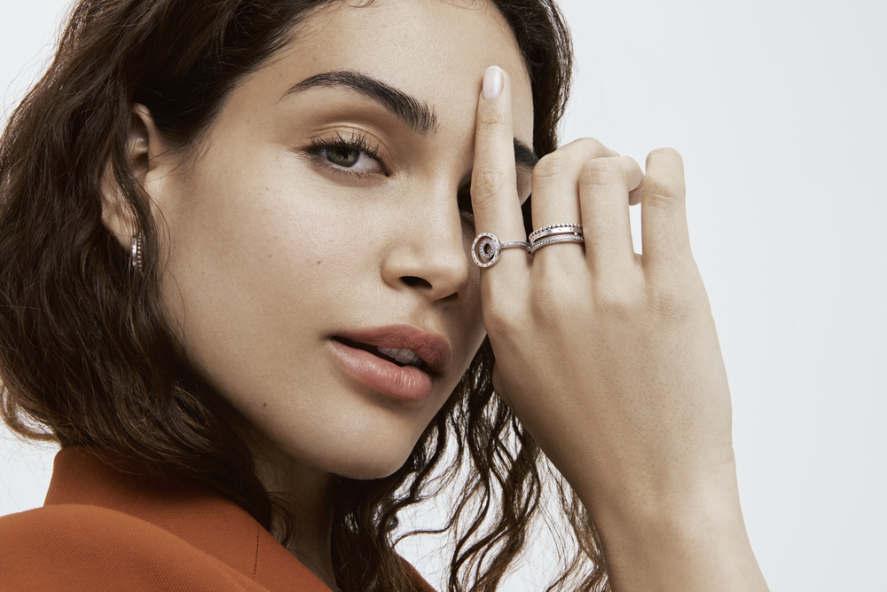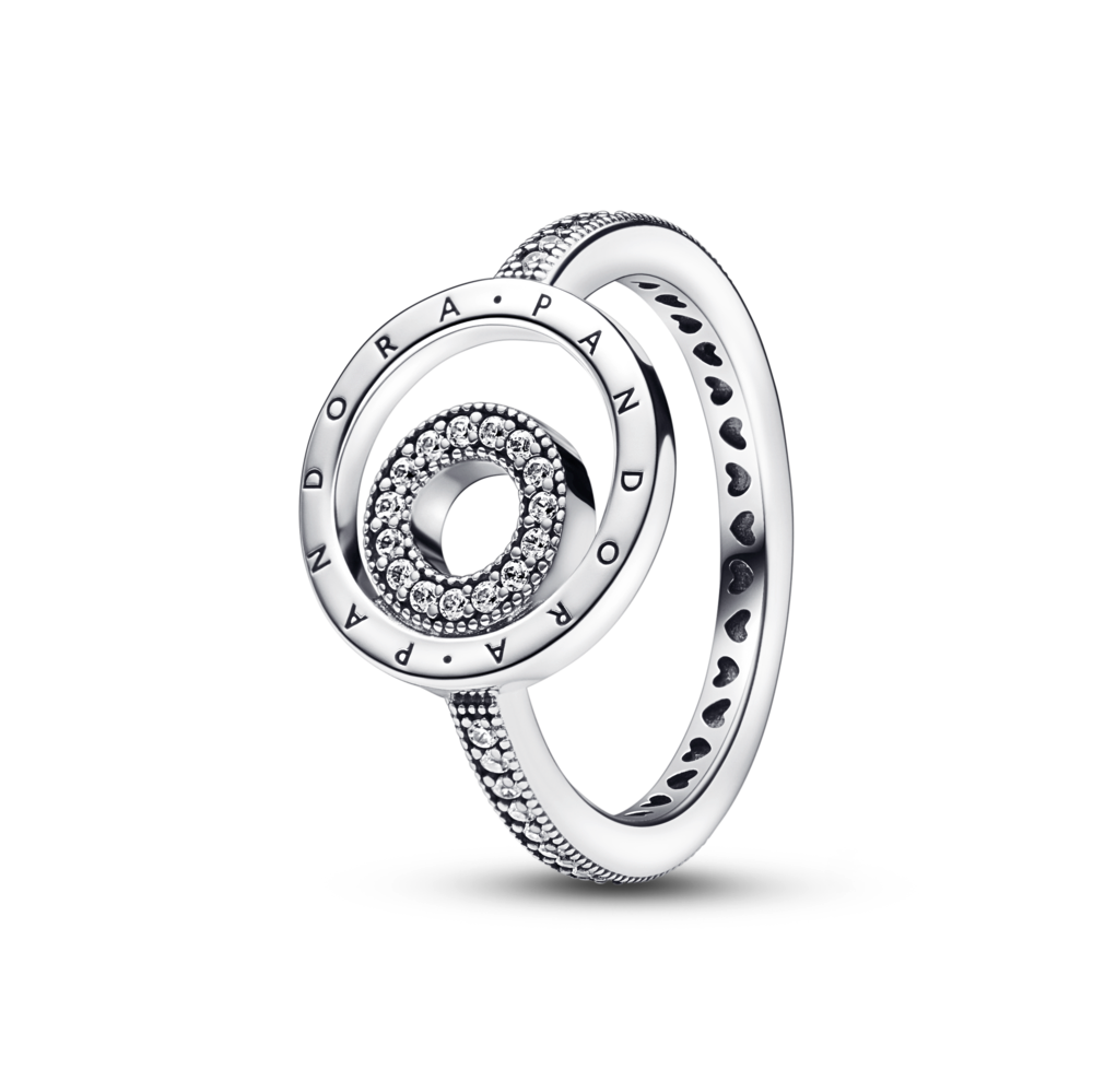 Crafted in sterling silver. the Signature Logo Circles Pavé Ring combines iconic design elements to create a sophisticated jewellery box staple. The off-centered placement of the inner circle adds a dynamic quality to the design. with rows of microbeading and pave for sparkle and texture. Wear this ring as a statement piece to elevate any outfit.