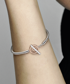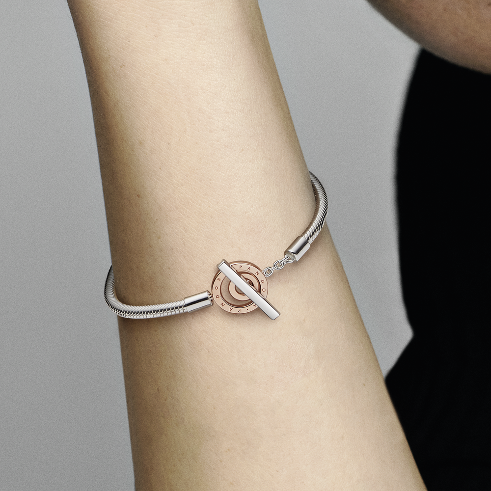 Make a statement with this bold and graphic piece. Inspired by our iconic pendant design. the Signature Two-tone Logo T-Bar Snake Chain Bracelet features a duo of 14k rose-gold plated circles forming a closure that can spin a full 360 degrees. A sterling silver T-bar attaches to the inner circle to secure the clasp. Add up to 18 of your favourite charms. dangles or pendants and tell your story with your signature style.