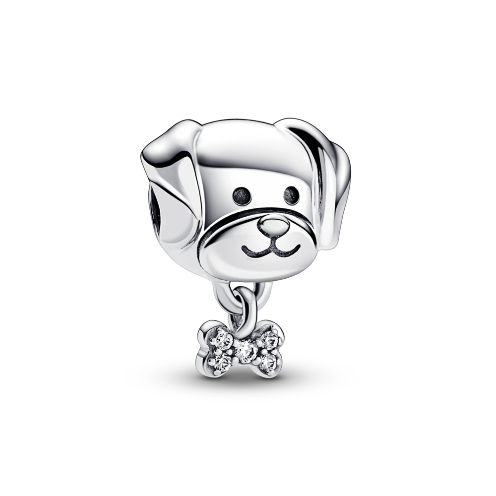 Let your love for your four-legged bestie shine with the Pet Dog & Bone Charm. Crafted from sterling silver. this retro piece with a modern touch is decorated with engraved lines on the face and sparkling pavé on the bone dangle. Wear it on a bracelet or charm holder to show your pooch’s special place in your heart.
