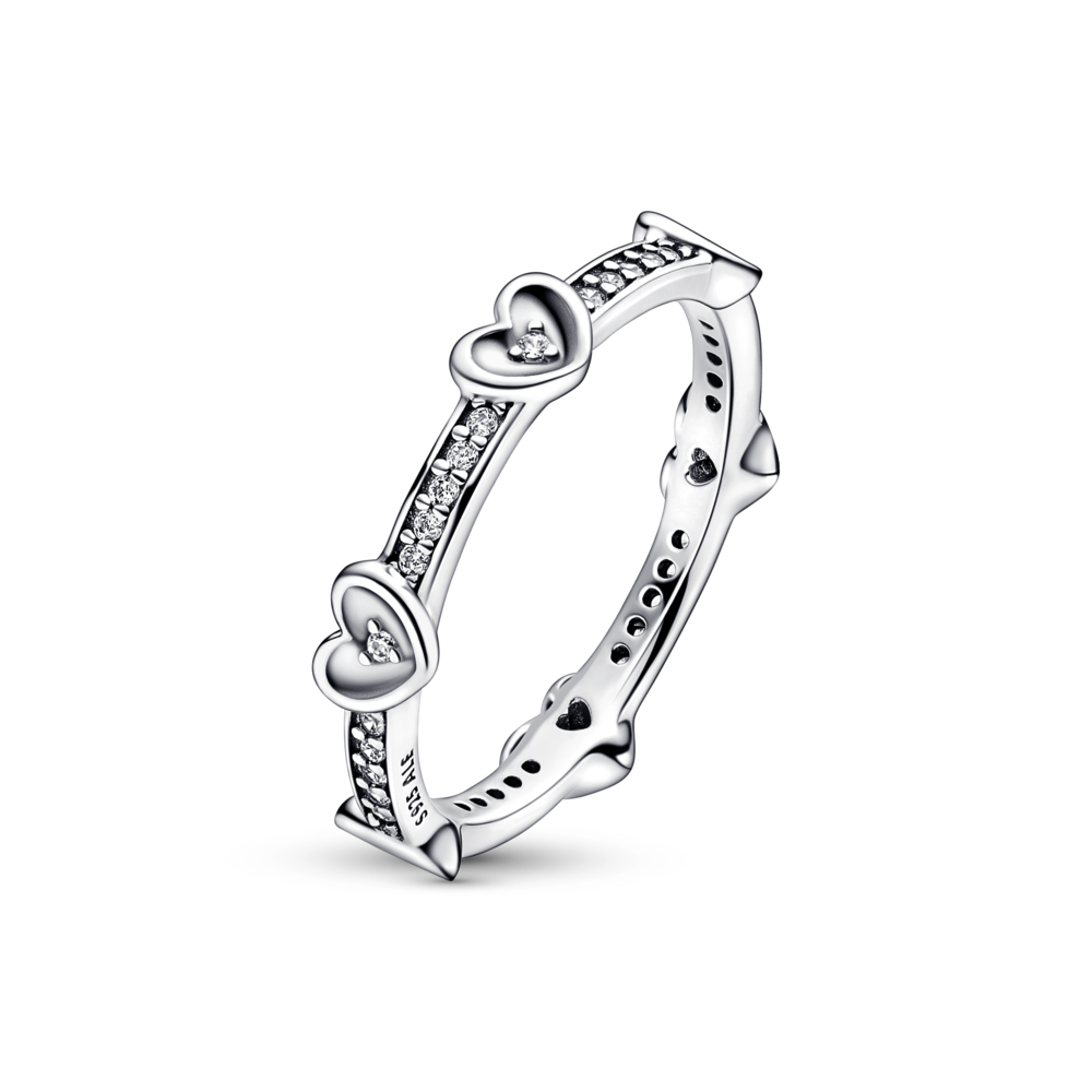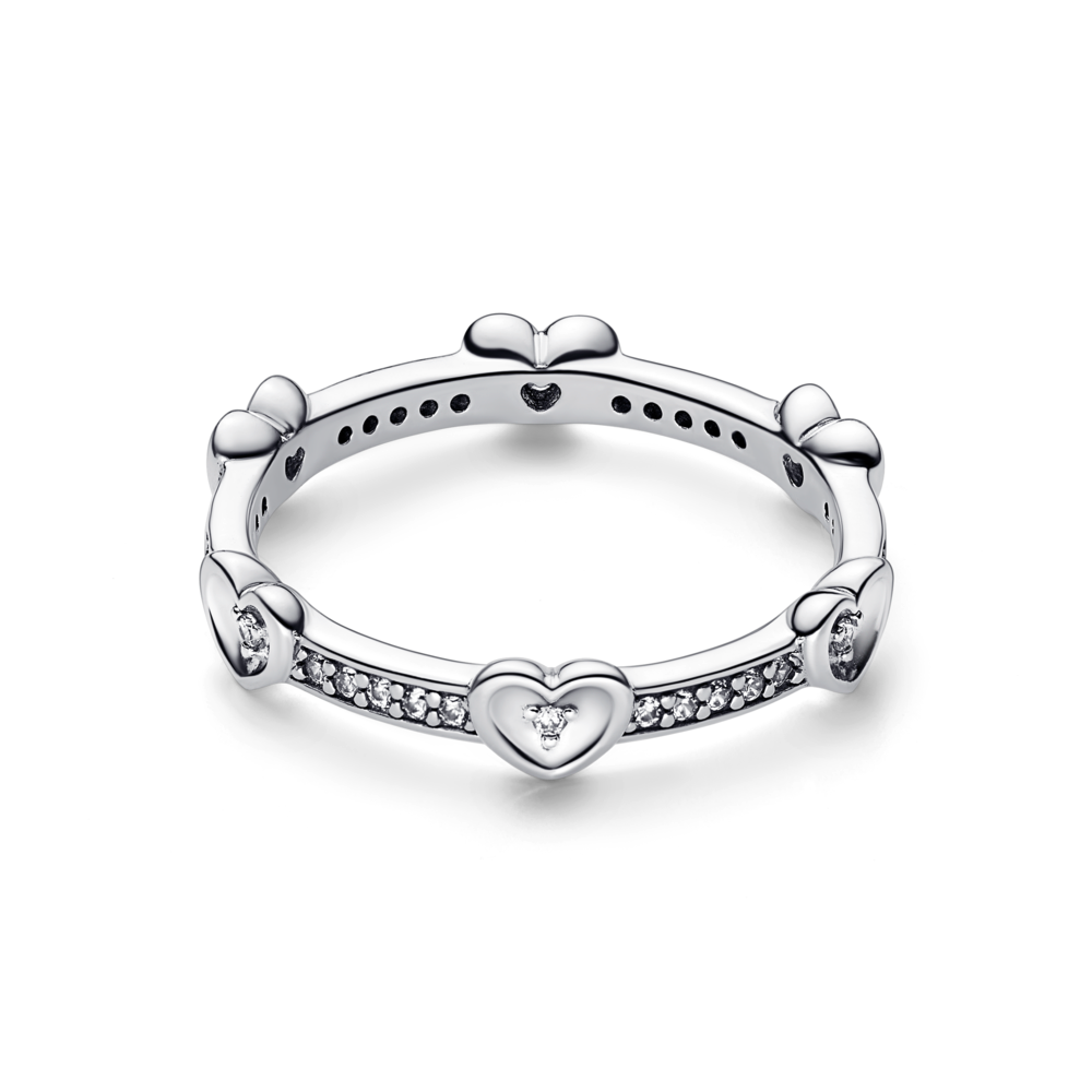 Special features: six raised hearts spread out around the ring shank; concave hearts with small faceted and raised outlines; hearts interrupting the shank; stone in center of each heart; a row of pavé between each raised heart; polished sides; functional holes for stone setting on the inside of the shank; six of them formed as hearts.