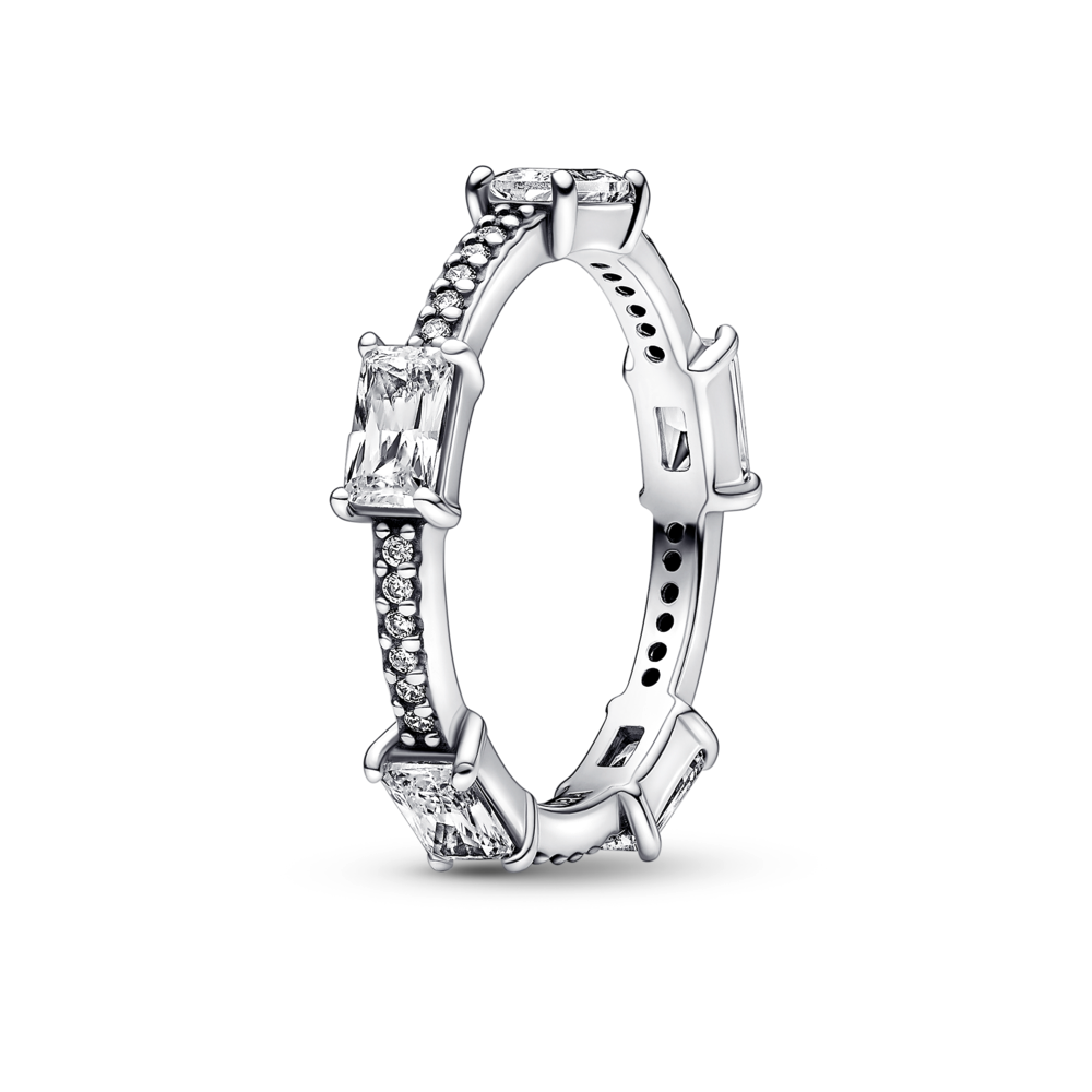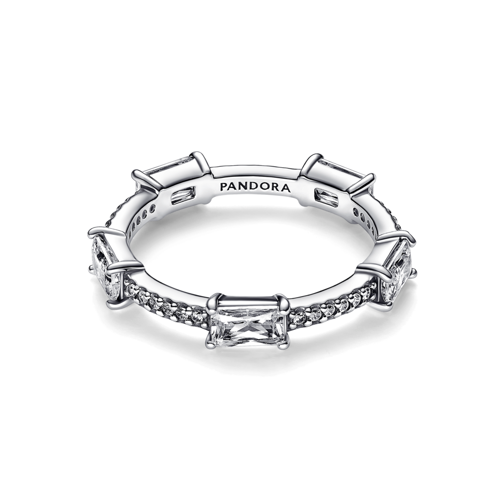 Sophisticated and elegant. this Rectangular Bars Sparkling Pavé Ring shines with an elegance that never goes out of style. Crafted from sterling silver. the band features a row of sparkling clear cubic zirconia pavé highlighted by five larger singular stones set at even intervals along the band. Inspired by classic tennis bracelets. this Timeless ring stacks beautifully and will effortlessly complement any look.