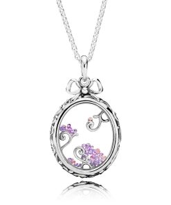MaInspired by traditional Victorian locket pendants. this sterling silver necklace is shaped from colourless synthetic sapphire windows that display tonal pink and purple stones within. The swirling frame lends depth and dimension to the design – and a regal touch perfect for any style queen. It’s fitted with a slider clasp for the perfect fit.terial: Sterling silver