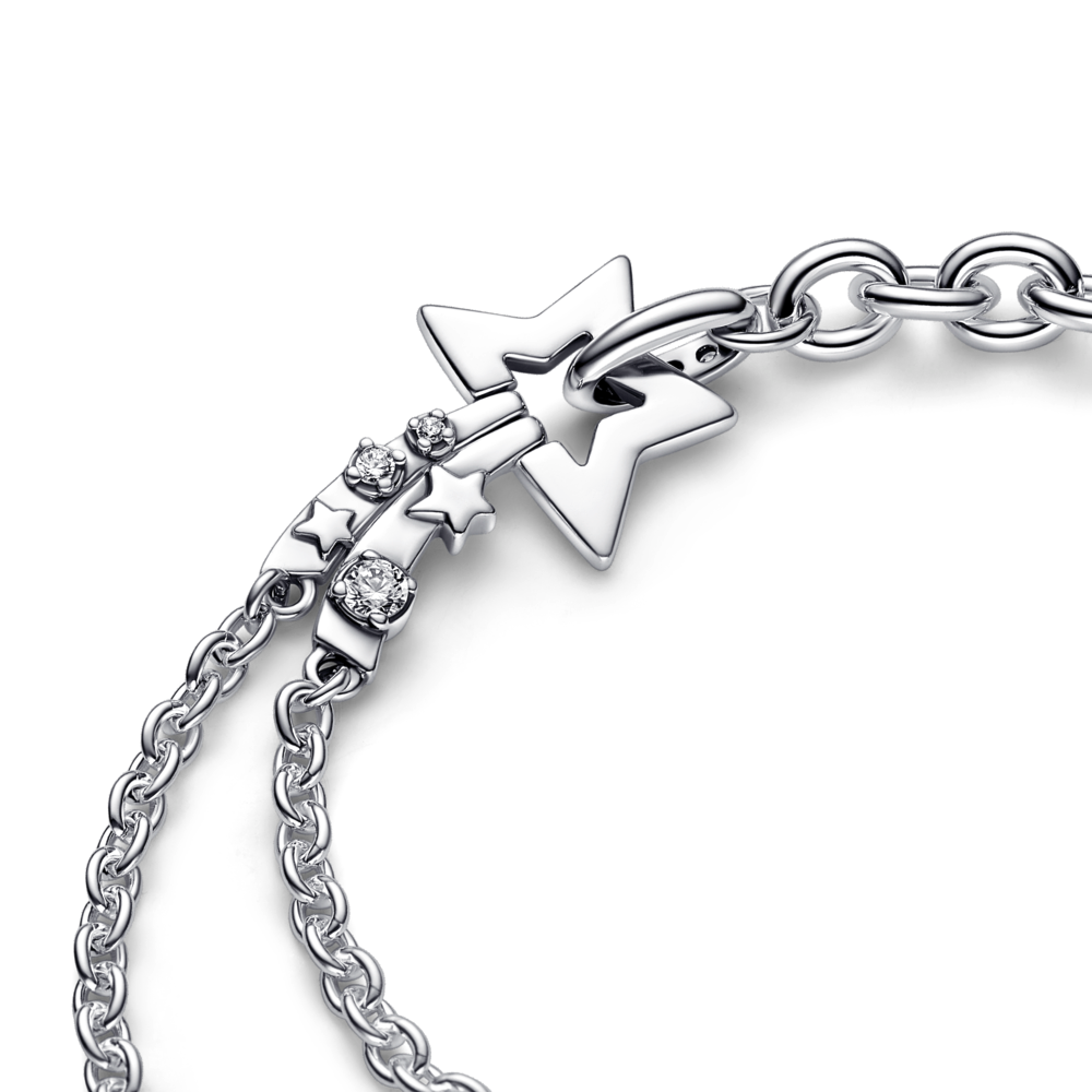 Wear the magic of the winter night sky as part of your bracelet stack. This asymmetrical bracelet features a central shooting star shape with two moving pieces forming star trails. leading into a double chain. a dynamic contrast with a larger chain on the other side of the bracelet. Crafted from sterling silver. the shooting star is set with sparkling round brilliant-cut cubic zirconia. so you can sparkle like the star you are for the holiday season and beyond.