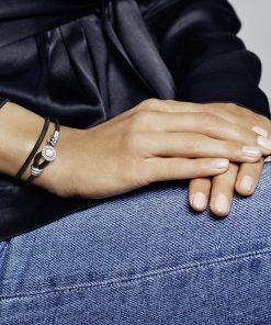 Crafted from genuine leather in go-with-anything black. this double wrap bracelet lends tough edge to your collection. The pared-back design features our new loop clasp in sterling silver. engraved with the PANDORA logo and set with glittering stones. Simply add your edit of charms.