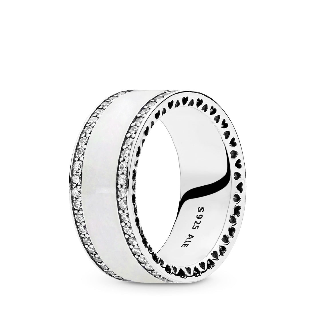 Make a soft yet bold statement with this wide hand-finished ring in sterling silver. Striking pearlescent enamel. lines of sparkling stones and cut-out hearts fuse minimalism with femininity.