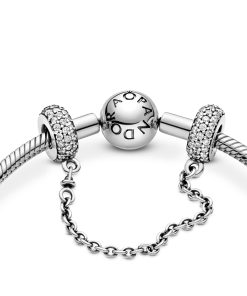 You’ve collected the charms that celebrate your memories and mark your milestones. now keep them safe on your Pandora Moments bracelet with this sterling silver safety chain charm. Accented with cubic zirconia for a sparkling finish. it’s decorative in its own right. and fitted with a swivel chain for tangle-free styling.